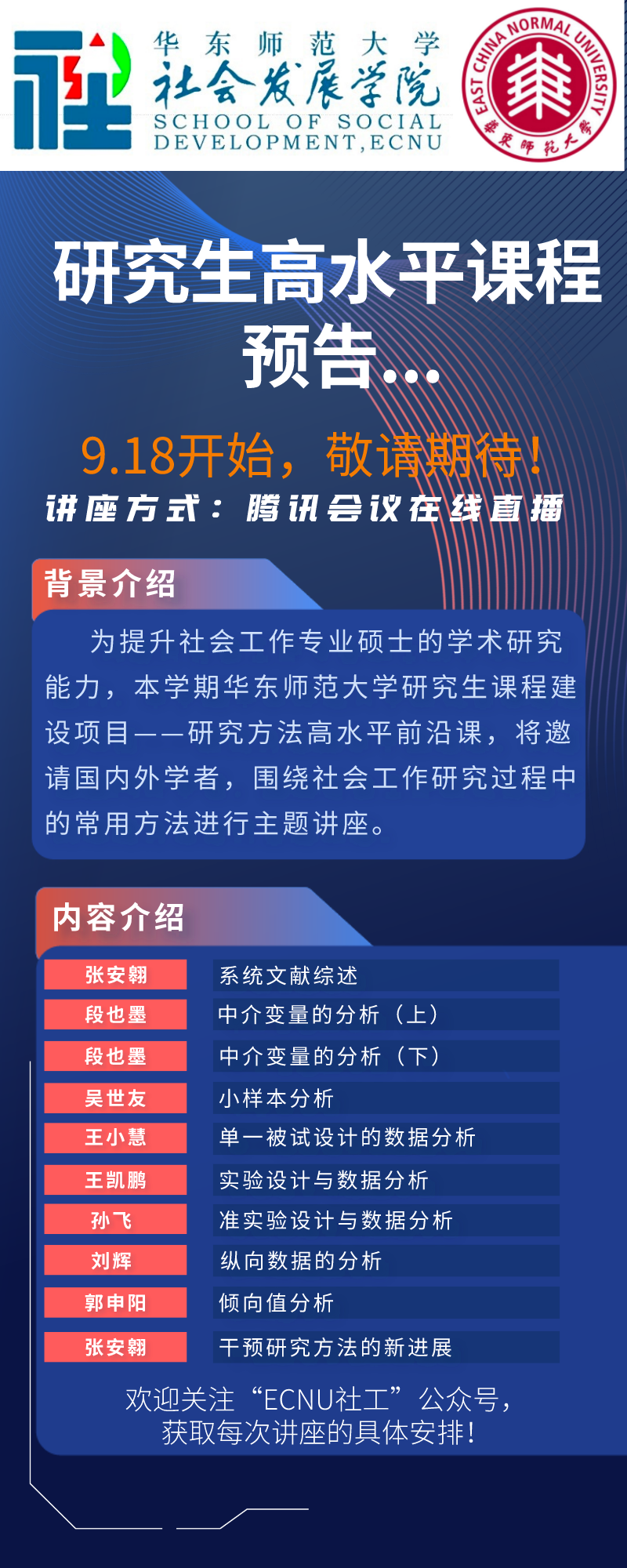 为提升社会工作专业硕士的学术研究能力,本学期华东师范大学研究生课程建设项目——研究方法高水平前沿课程,将邀请国内外优秀学者,围绕社会工作研究过程中的常用方法进行主题讲座。