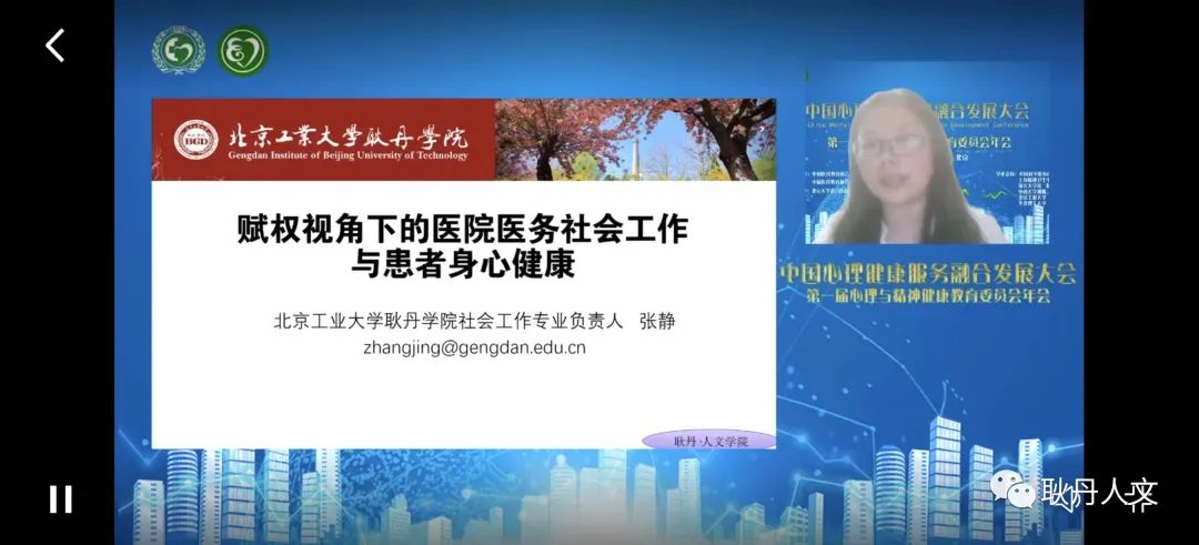 张静就“赋权视角下的医院医务社会工作与患者身心健康”作了专题发言。她首先介绍了北京工业大学耿丹学院的概况、专业及在医务社会工作人才培养方面的努力,作为2021年北京市一流专业承接本次大会医务社会工作论坛的缘由;其次,张静分享了医务社会工作的概念界定;并以在顺义区医院康复科开设小组活动为例,诠释赋权视角下的医院医务社会工作如何基于患者、社工、医护及科室等合作提供专业服务,如何基于患者需求开展多学科合作,共同倡导推进医务社会工作的制度建设。